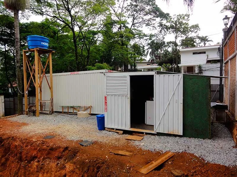 Como adaptação para sanitários, o container é equipado com sete banheiros, sete chuveiros e 3 vasos sanitários, podendo ter essa configuração alterada conforme a necessidade do cliente.
